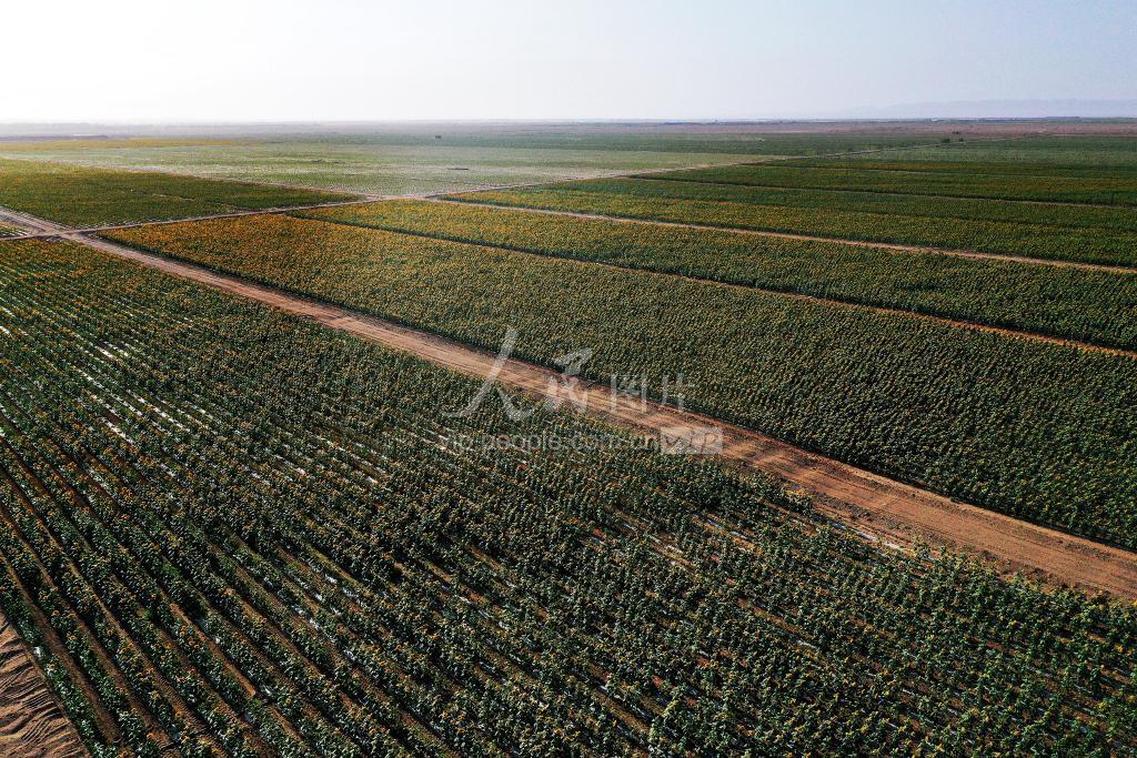 2020年8月4日,甘肃省张掖市高台县黑泉镇十坝滩上种植的千亩向日葵迎风绽放,如金色的海洋。 近年来,高台县按照“规划先行、生态优先、科学布局、定位高端”的基本思路, 通过企业带动、农户参与、科技支撑的方式,大力发展戈壁农业。目前,全县戈壁农业面积超过10万亩。今年首次在十坝戈壁滩上引进食用向日葵新品种SH363,种植面积达1800亩,长势良好。