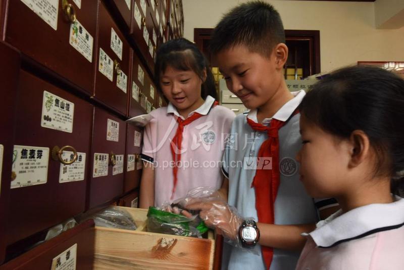 2020年8月5日,江苏省连云港市东海县青湖镇留守儿童正在参观非遗中医药文化,暑假是“药”过“药”精彩。进入暑假以来,江苏省连云港市东海县组织留守儿童开展了“体验非遗中医药文化、传承国粹精髓”的活动,留守儿童在中药药剂师指导下,“零距离”体验鉴别中药材、中药材配伍、中药材炮制等中医药学领域知识,加深对中华非遗传统博大精深的中医药学的印象,感受非遗传统中医药文化的魅力。