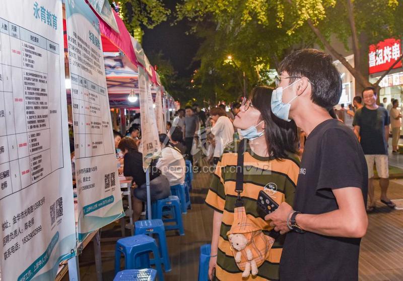 2020年8月8日晚,浙江省金华市婺城区西市街上举行的首届人才夜市招聘会吸引了不少市民前来。