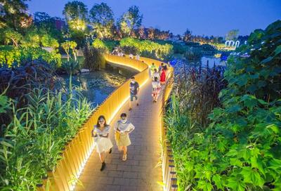 2020年8月8日,四川省成都市天府芙蓉园,绿树成荫,满目苍翠,鲜花竞相绽放,吸引不少市民游客前来观光游玩。