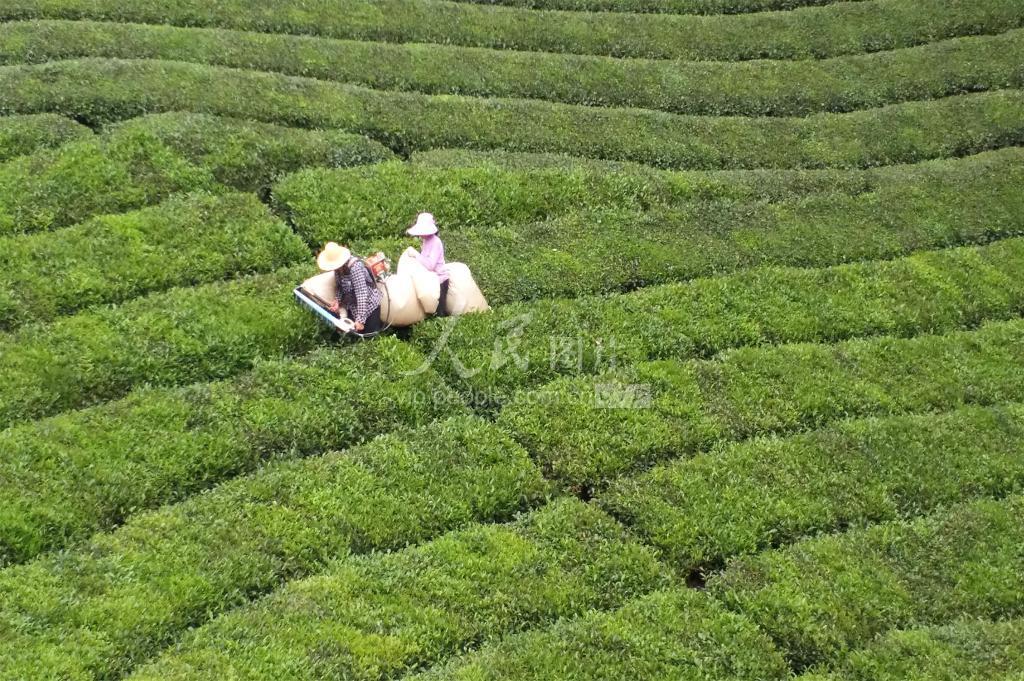 2020年8月11日,湖北省宜昌市夷陵区邓村乡茶农在生态茶园里用采茶机采收秋茶。