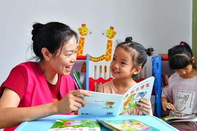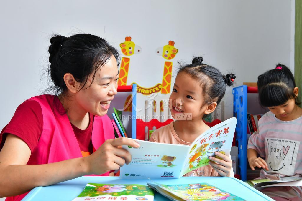 2020年8月20日,四川省广安市广安区巾帼志愿者在石笋镇鳌山村“儿童之家”陪伴孩子阅读课外书籍。