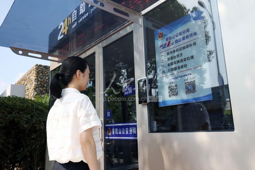 2020年8月21日,浙江省舟山市一位市民正在“刷脸”进入24小时无人自助警务超市内进行业务办理。 据了解,这是舟山市首个24小时无人自助警务超市。该警务超市可通过“刷脸”进入,内部设置了身份证自助申请机、港澳台自助签注机、车辆违章自助处理机等设备。投入使用后,市民和游客可随时查询公安行政审批、户籍、出入境、交管办事流程和办证,既方便了群众也缓解了警力。 同时,警务超市设立了业务办理、警务资讯、信访投诉以及犯罪线索的举报,做到警务事项“应上尽上、全程在线”。