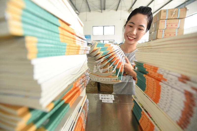 2020年8月24日,江苏省连云港市东海县青湖镇中心小学老师正在对新教材进行整理归类。暑假新学期开学在即,连云港市东海县200多所学校1万多名中小学、幼教老师提前到校,积极投入到新教材的整理和分发工作中,确保暑假开学学生按时用上新教材。