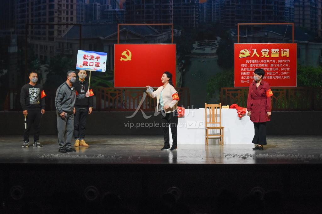 2020年8月27日晚,湖北省第四届地方戏展演剧目汉剧《老八栋的灯塔》在荆州首演,演员在舞台表演。