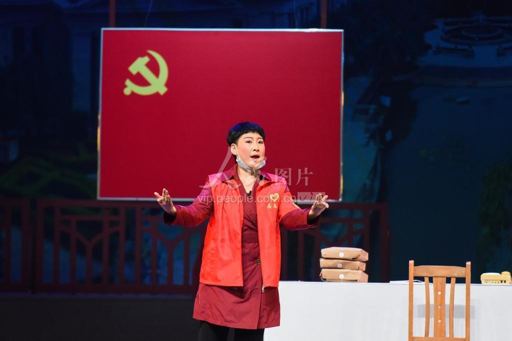 2020年8月27日晚,湖北省第四届地方戏展演剧目汉剧《老八栋的灯塔》在荆州首演,演员在舞台表演。