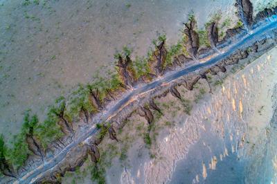 2020年8月29日,江苏省南通市如东县小洋口海涂湿地,由潮汐形成的海涂湿地自然纹理如一幅幅创意画。湿地保护区加大自然生态修复,数千亩的大米草与潮汐形成的纹理构成一幅幅完美的画卷。