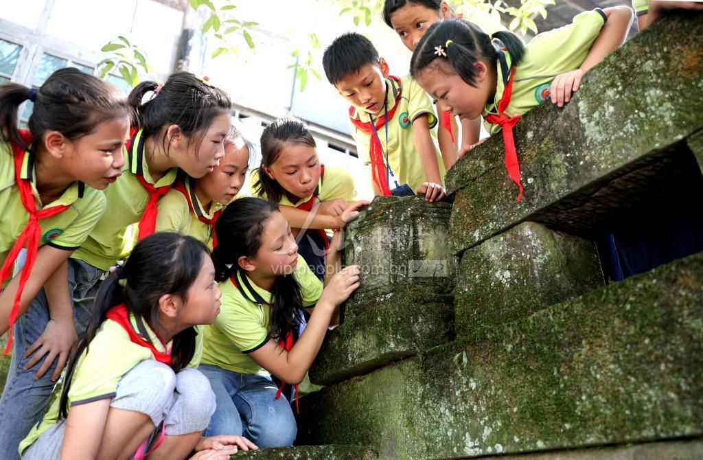 2020年9月1日,四川省泸州市纳溪区天仙镇中心小学的学生在认真阅读刻在石柱上的抗战文字。