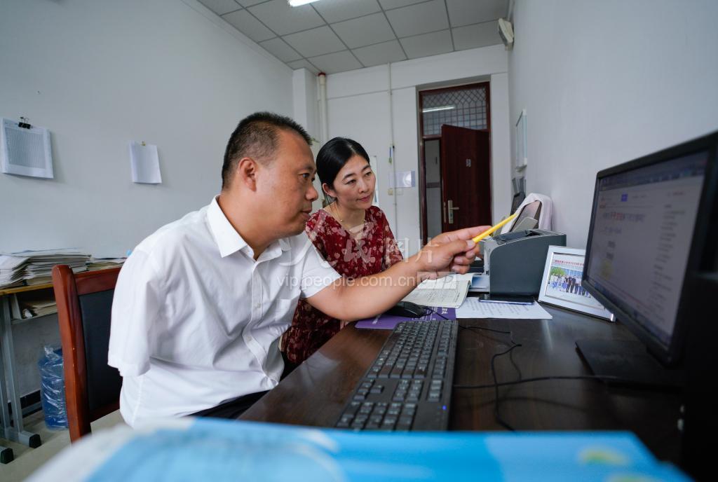 2020年9月7日,河北省黄骅市第三中学教师李福龙(左一)正在和同事讨论教学内容。