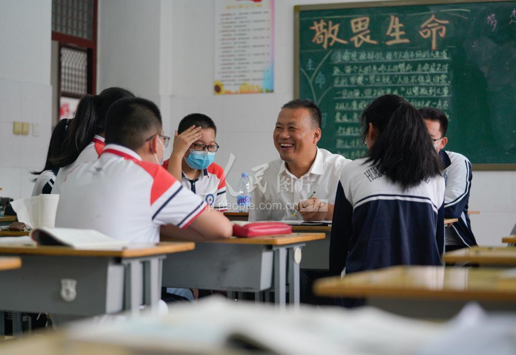 2020年9月7日,河北省黄骅市第三中学教师李福龙在课间和学生交谈了解学生学习生活情况。