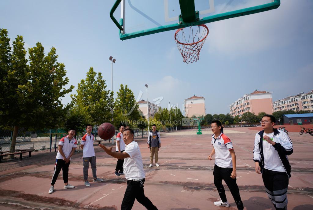 2020年9月7日,河北省黄骅市第三中学教师李福龙(中)在课间和学生打篮球。