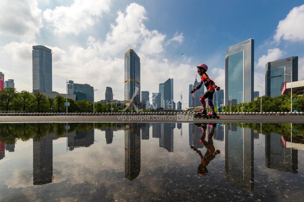 2020年9月13日,广州,夜晚大雨后的早晨天高云淡,空气清爽,大批市民前往天河体育中心运动健身,在体育馆前的广场骑车、跑步、跳舞、滑板,展现生活健康新时尚。