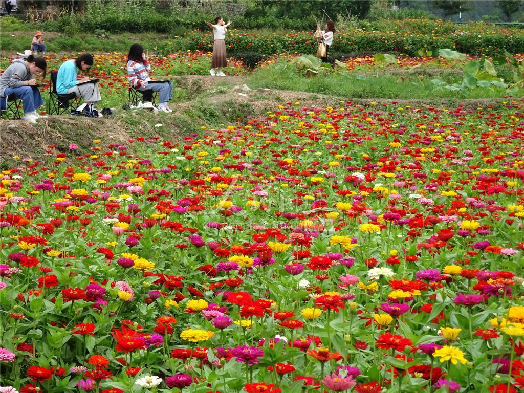 2020年9月13日,安徽黄山市黟县宏村镇宏村村东大片种植的百日草花竞相绽放,进入最佳赏花期。浪漫花海成艺术院校师生的写生新景,也引来游览宏村景区的游客。