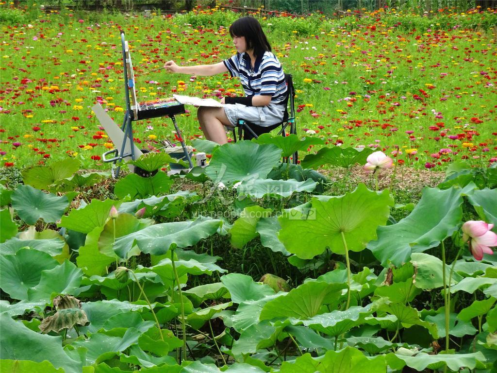 2020年9月13日,安徽黄山市黟县宏村镇宏村村东大片种植的百日草花竞相绽放,进入最佳赏花期。浪漫花海成艺术院校师生的写生新景,也引来游览宏村景区的游客。