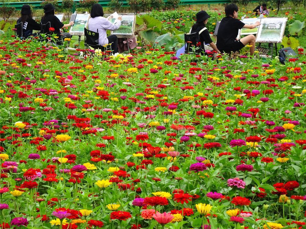 2020年9月13日,安徽黄山市黟县宏村镇宏村村东大片种植的百日草花竞相绽放,进入最佳赏花期。浪漫花海成艺术院校师生的写生新景,也引来游览宏村景区的游客。
