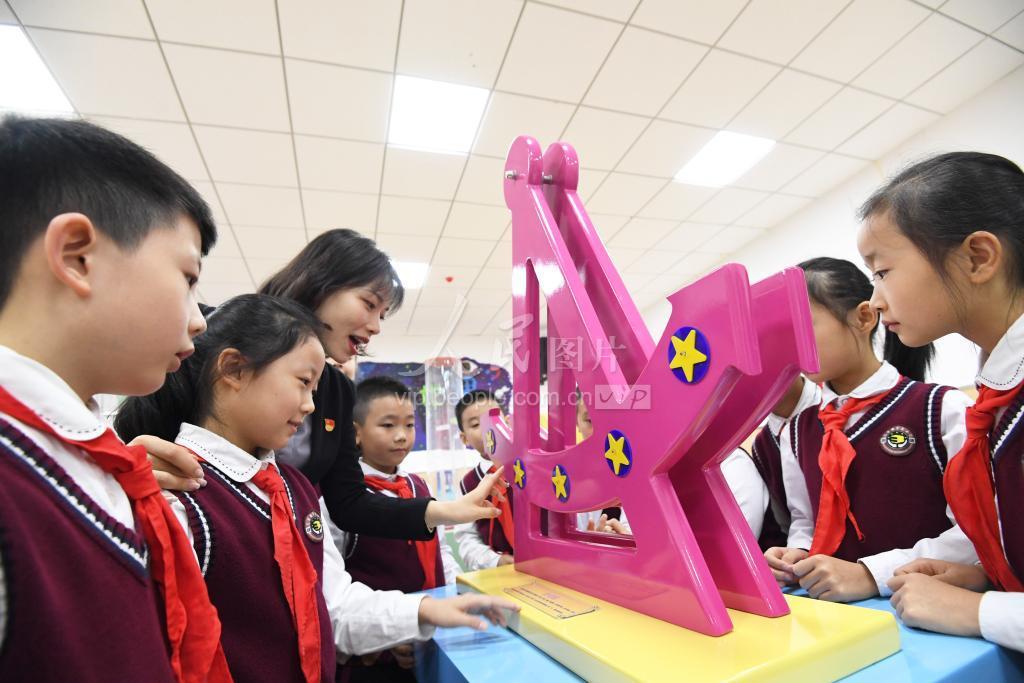 9月15日,在贵州省贵阳市南明区花果园第三小学校园科技馆内,老师正在指导学生体验“发电锚”。
