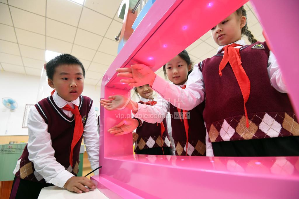 9月15日,在贵州省贵阳市南明区花果园第三小学校园科技馆内,同学们正在体验“光琴”。