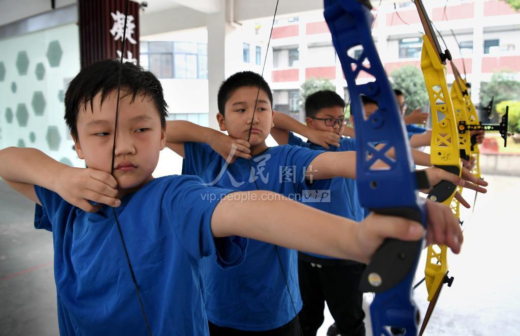 2020年9月15日,在合肥市瑶海区临泉路第二小学,孩子们在老师的指导下练习射箭技艺。