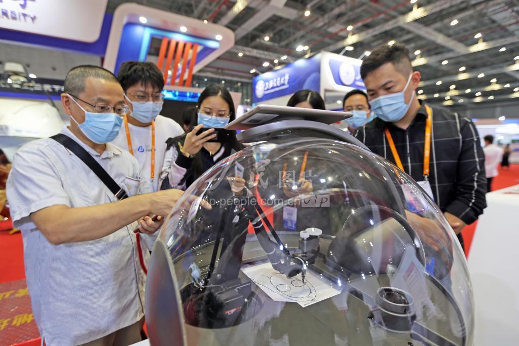 2020年9月15日,上海,观众在第二十二届中国国际工业博览会观看北京大学的智能画像机器人现场作画。