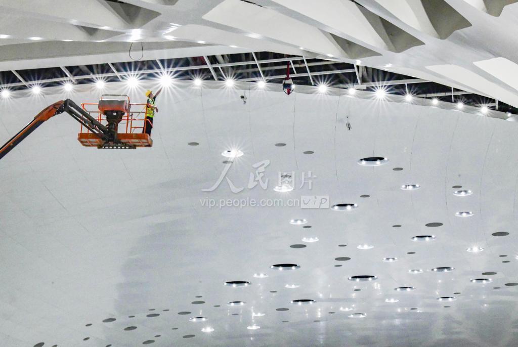 2020年9月15日晚,位于海口滨海大道的海南国际会展中心二期项目,工人正在主序厅调试灯光设备。 目前,该项目正进行内部设施系统调试,为场馆正式投入运营做准备。据悉,该项目分为南馆和北馆,南馆以展览为主,北馆则以精品展和会议为主,打造国内领先的现代化绿色智能会展场馆,为举办大型国家级展会提供硬件支持,助力自贸港区域性国际会展中心建设。