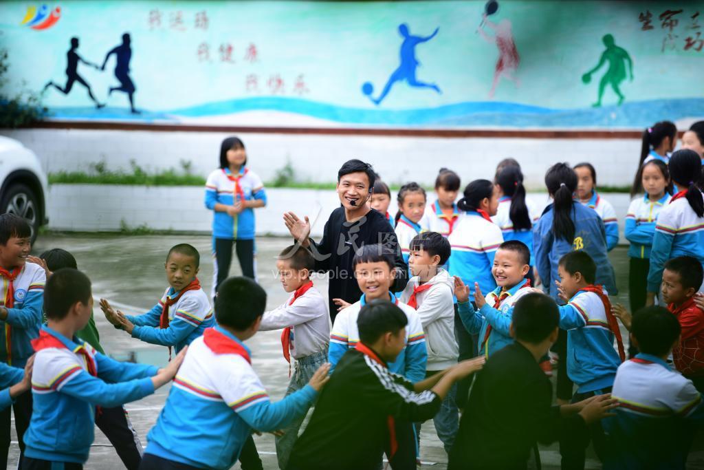 2020年9月16日,在贵州省毕节市织金县龙场镇双山小学,彭有兴带领学生进行课外活动。