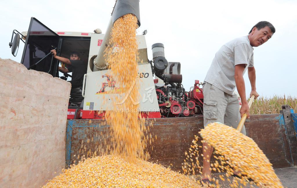 9月16日,安徽省亳州市蒙城县三义镇代敏农机合作社的农机手正在帮助农户从收割机上卸下刚收获的玉米,并运送到指定的位置。