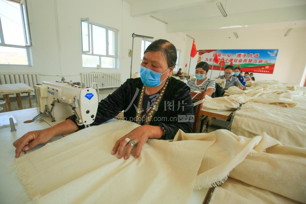 2020年9月17日,工人在新疆昌吉回族自治州呼图壁县五工台镇福海新村的“卫星工厂”赶制棉花包订单。近年来,呼图壁县因地制宜,构建“总部+卫星工厂”发展模式,助力农牧民在家门口就业增收。