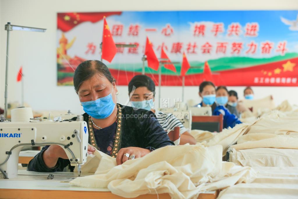 2020年9月17日,工人在新疆昌吉回族自治州呼图壁县五工台镇福海新村的“卫星工厂”赶制棉花包订单。近年来,呼图壁县因地制宜,构建“总部+卫星工厂”发展模式,助力农牧民在家门口就业增收。