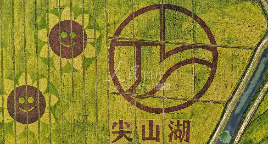 2020年9月24日,安徽省巢湖市庙岗乡尖山湖逸趣园内巨幅稻田画以秋色为“颜料”,以稻田为“画布”。