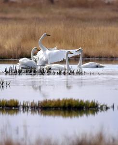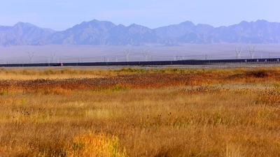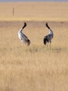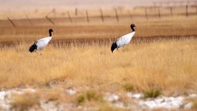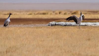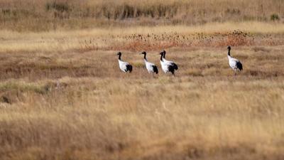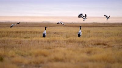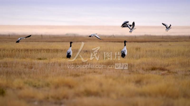 2020年9月28日,甘肃省酒泉市阿克塞哈萨克族自治县境内苏干湖草原湿地景色优美,黑颈鹤在色彩斑斓的草原上活动。