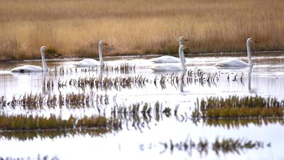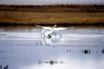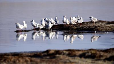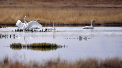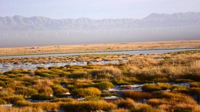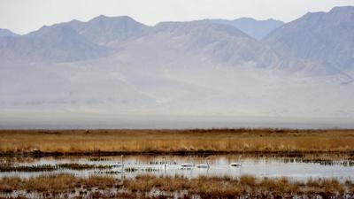 2020年9月28日,甘肃省酒泉市阿克塞哈萨克族自治县境内的苏干湖水平如镜,草原湿地间候鸟聚集,景色迷人。 地处河西走廊最西端的甘肃省酒泉市阿克塞哈萨克族自治县境内的大、小苏干湖,位于阿尔金山南麓,总面积19.6平方公里,是甘肃省最大的内陆湖泊,属省级自然保护区。