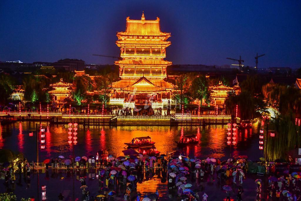 2020年10月2日晚,山东台儿庄古城华灯初上,有人乘坐摇橹船欣赏古城美景,乐享国庆假期。