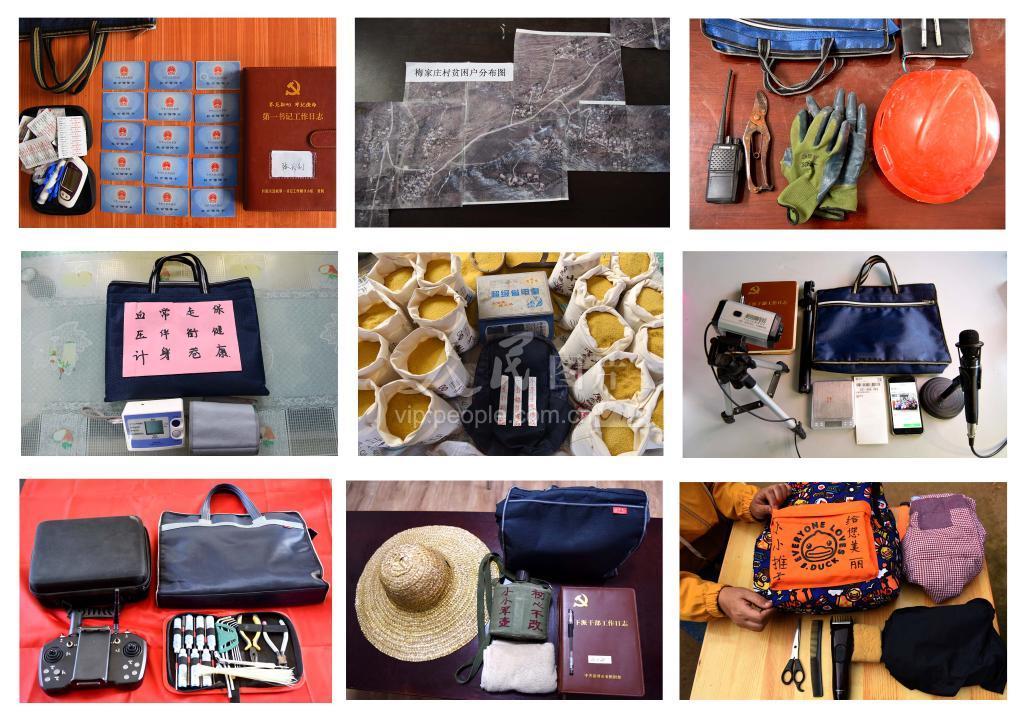 这张拼版图片显示的是,近日在山东省淄博市沂源县拍摄的部分驻村第一书记公文包里的小物件。