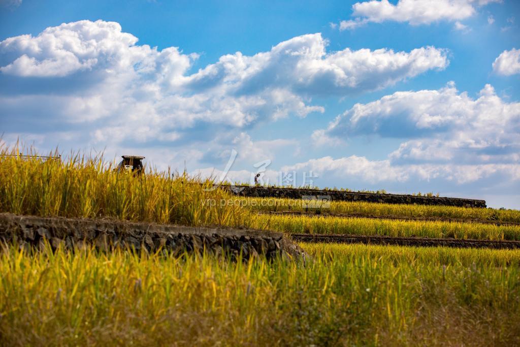 2020年10月8日,浙江省新昌县龙皇堂村的梯田里的稻田秋色,遍地金黄。 金秋时节,稻谷进入收获季,稻田一片金黄,景色宜人,一片片稻田交织成了一幅色彩明快的田园画卷。吸引很多游客和摄影爱好者前往拍摄。