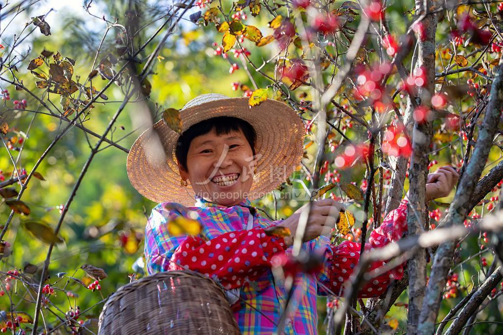 秋高气爽时节,浙江省杭州市淳安县当地群众趁着天气晴好采摘特色中药材山茱萸增加收入。