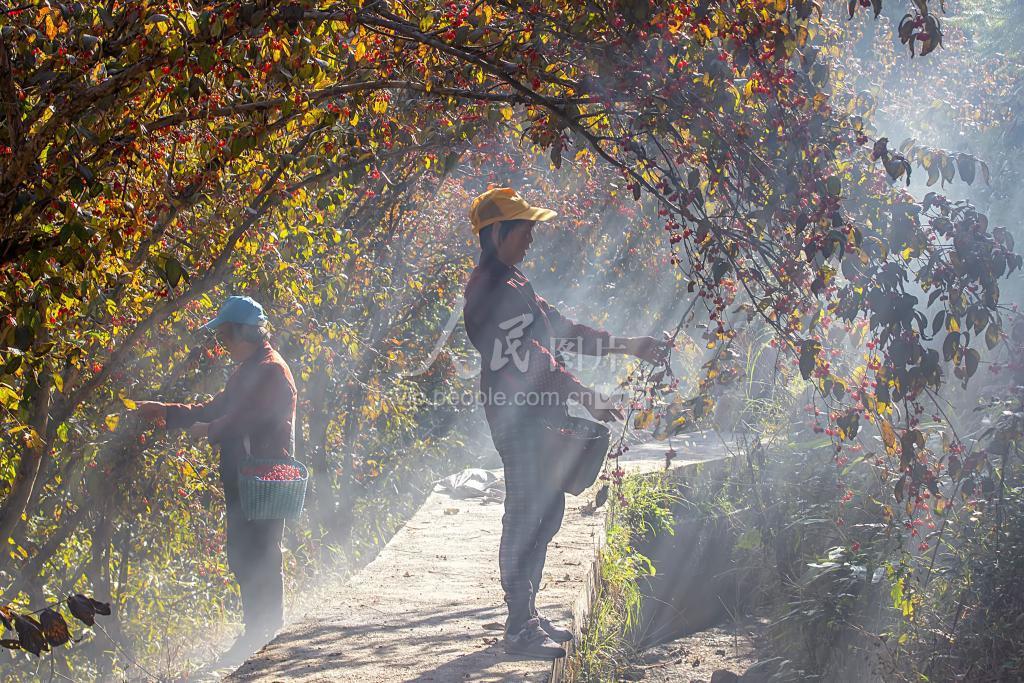 秋高气爽时节,浙江省杭州市淳安县当地群众趁着天气晴好采摘特色中药材山茱萸增加收入。
