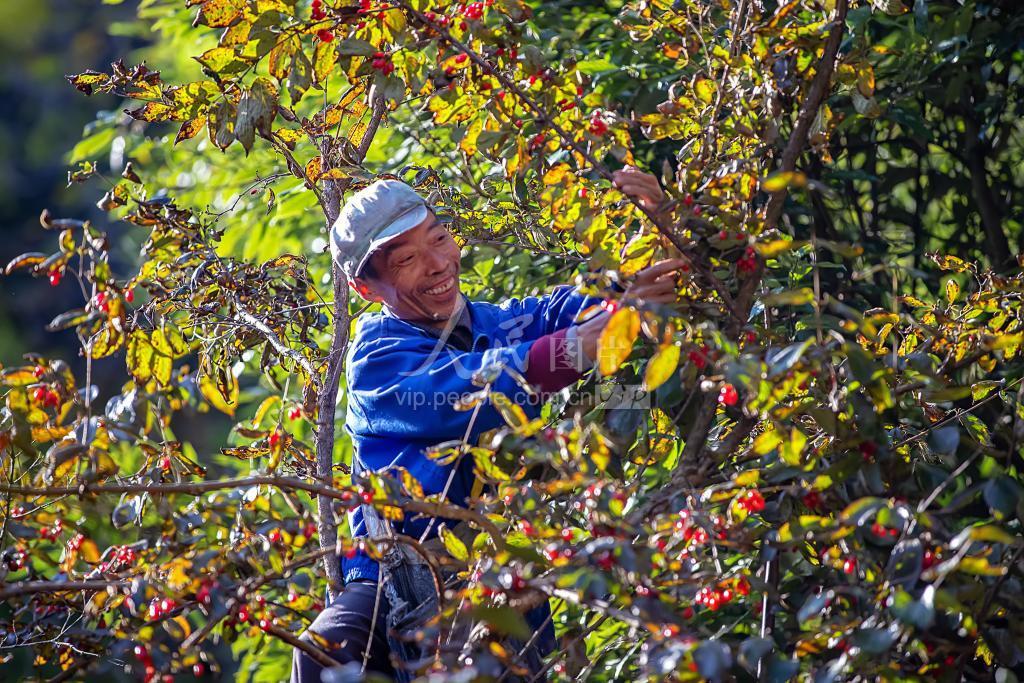 秋高气爽时节,浙江省杭州市淳安县当地群众趁着天气晴好采摘特色中药材山茱萸增加收入。