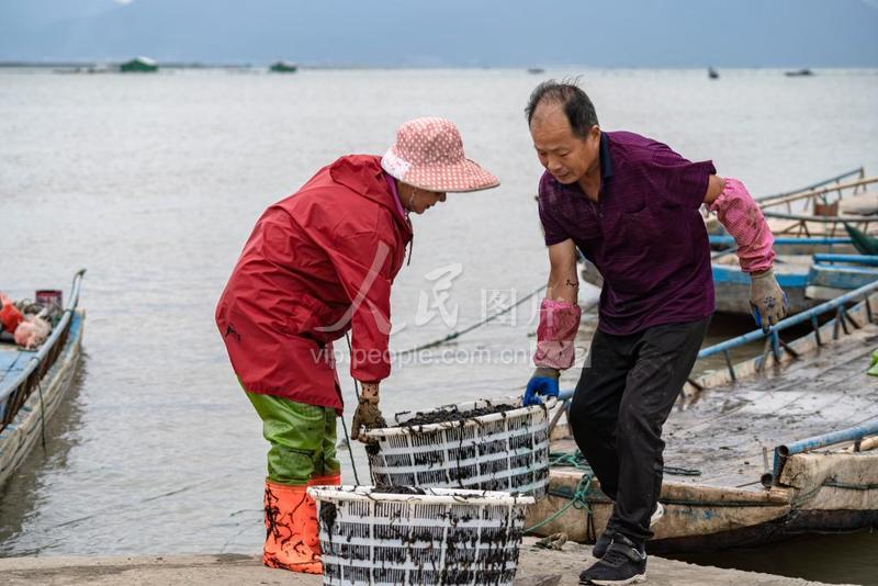 10月13日,宁波市象山县黄避岙乡紫菜养殖户正在将新鲜紫菜运上岸。