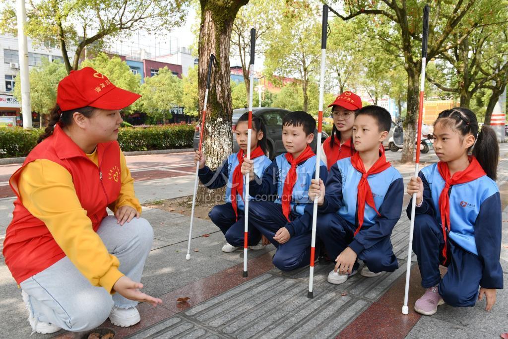 在10月15日国际盲人节来临之际,江西省抚州市南丰县青年志愿者协会联合该县琴城镇琴湖路社区开展“体验盲道 关爱盲人”主题活动。志愿者带着小朋友手拄盲杖蒙眼走盲道,体验盲人行走的艰难,呼吁市民自觉让出盲道,关爱盲人。