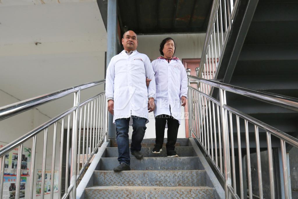10月13日,在位于贵州省毕节市七星关区长春堡镇清丰社区的毕节市盲人技能培训学校,杨庆国(左)和妻子尹贵先正在下楼。
