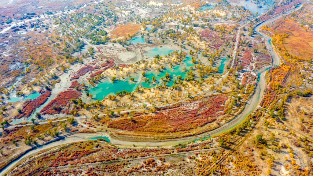 金秋时节,位于塔克拉玛干沙漠北缘、塔里木河中下游的新疆巴音郭楞蒙古自治州尉犁县境内,沙漠、塔河、胡杨、红柳等共同绘就出大地五彩斑斓的绚丽景色。