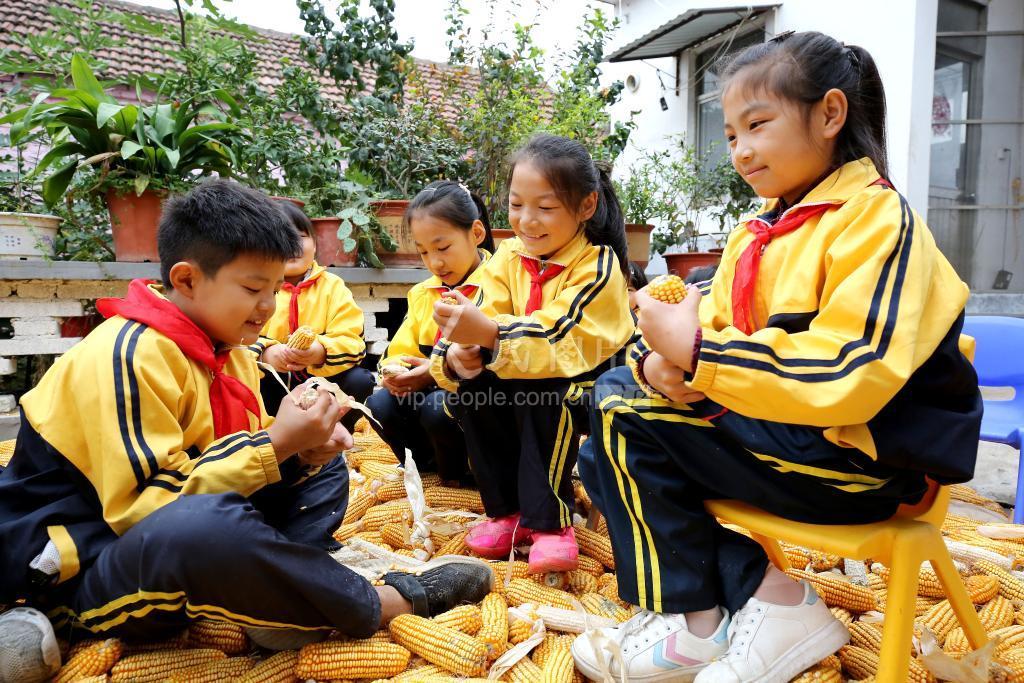 2020年10月15日,山东省枣庄市齐村镇良庄小学学生在农家小院里帮助农民剥玉米粒。