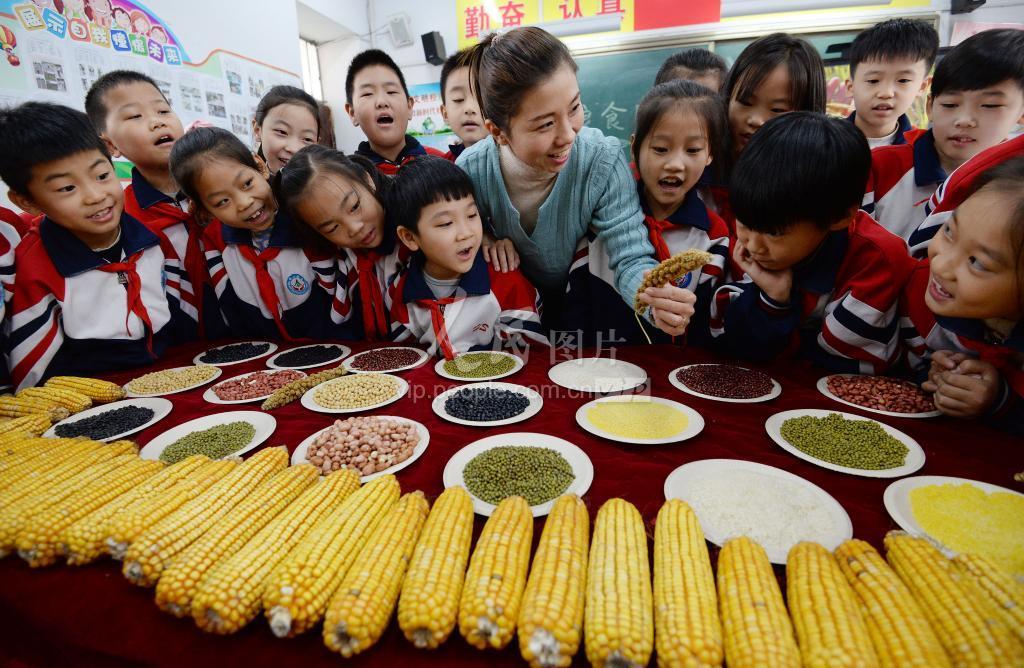 2020年10月15日,河北省邯郸市火磨小学的学生在老师的指导下学习辨识粮食。