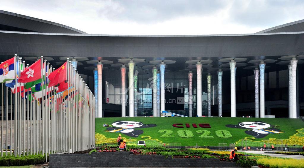 2020年10月15日,上海,当天是第三届中国国际进口博览会倒计时20天,各项筹备工作都已进入最后冲刺阶段。在国家会展中心的南广场,主题迎宾花卉图案正在加紧布置之中。