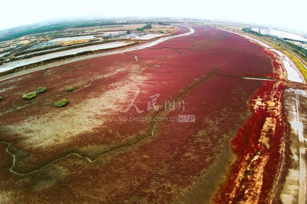 深秋时节,山东省青岛市胶州湾河流入海口的碱蓬草渐渐由红变紫,梦幻般的色彩绘就一幅自然生态奇观。