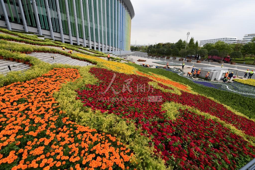 2020年10月17日,第三届中国国际进口博览会举办地上海国家会展中心现场,工作人员为南广场摆放主题迎宾花卉图案。