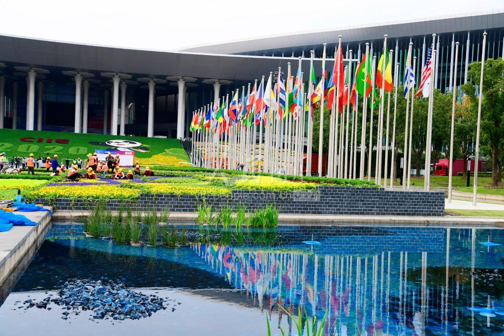 2020年10月17日,第三届中国国际进口博览会举办地上海国家会展中心现场,工作人员为南广场摆放主题迎宾花卉图案。