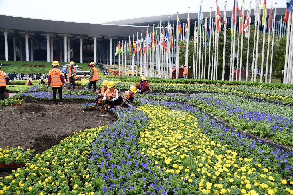 2020年10月17日,第三届中国国际进口博览会举办地上海国家会展中心现场,工作人员为南广场摆放主题迎宾花卉图案。