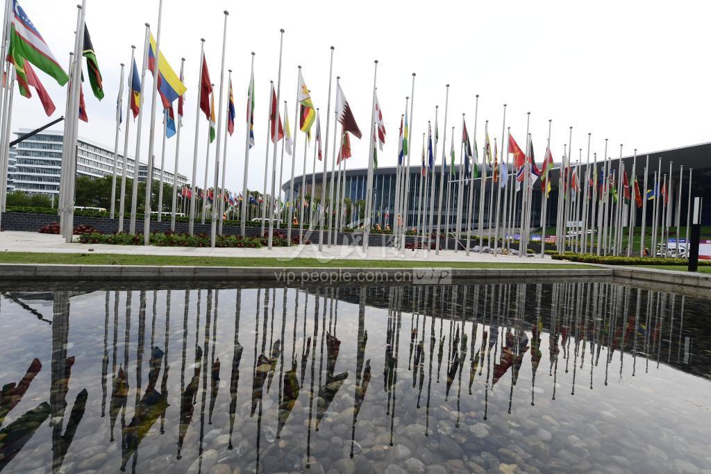 2020年10月17日,第三届中国国际进口博览会举办地上海国家会展中心现场,工作人员为南广场摆放主题迎宾花卉图案。第三届进博会主题迎宾花卉图案设计以自上而下的“云山—梯田花海—河流—现代城市花园”四个空间脉络,360度显示中国锦绣缤纷的自然之美。体现传统与现代的对话。花卉植物呼应主题的维多利亚鼠尾草、蓝紫色角堇等蓝紫色为基调,体现金秋的向日葵、孔雀草、百日草等金黄色草花,另外结合少量蓝色调的再生玻璃等非植物材料,体现可持续的环保理念。
