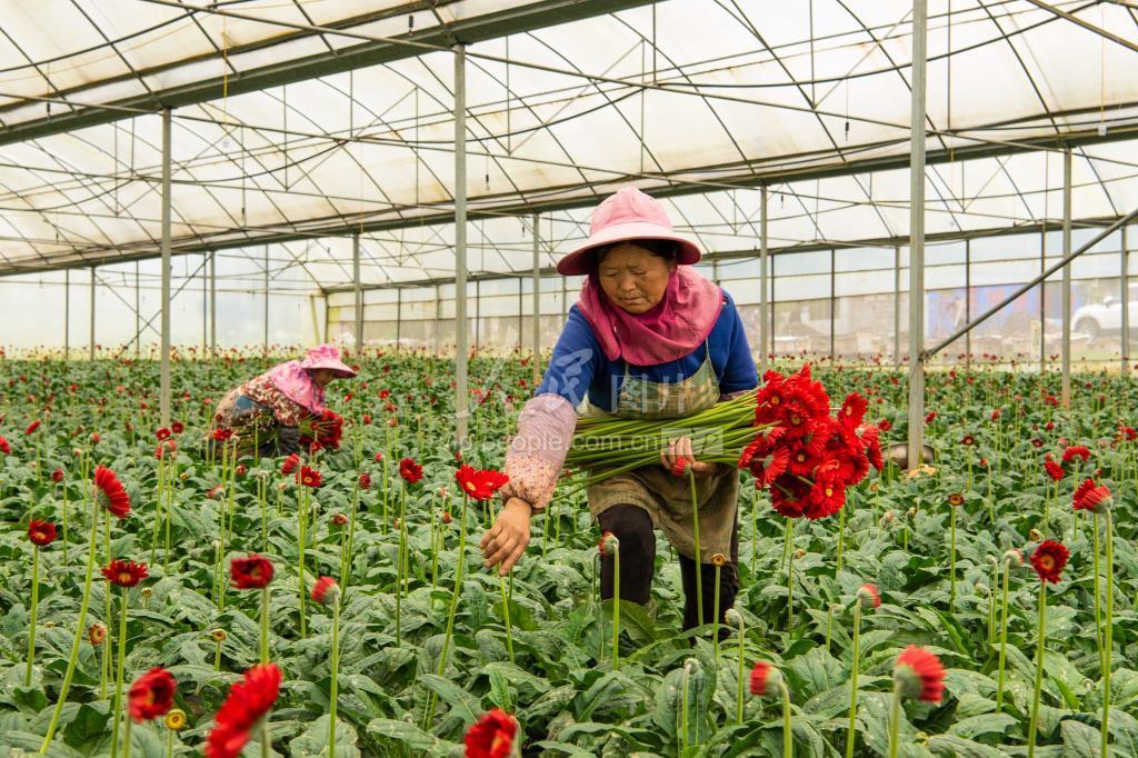 图片说明: 2020年10月18日,村民在贵州省毕节市黔西县协和镇杨柳村花卉产业园区采摘非洲菊鲜花。
